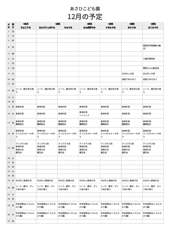 新着情報 2025年12月22日 園開放日について 2025年12月12日 トピックスを追加しました 2025年07月14日 採用情報 更新しました 2016年03月31日 ホームページをリニューアルしました 今月の主な行事