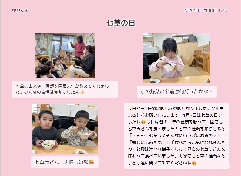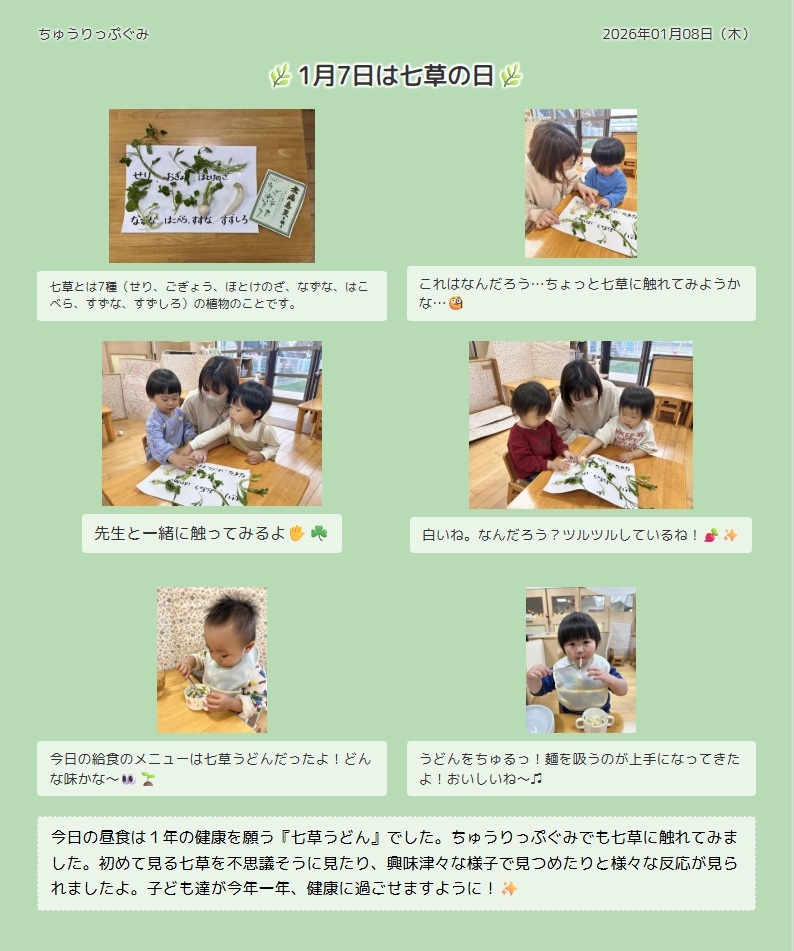 昨日が七草の日でした。本日より1号認定の子ども達が冬休みを終え登園して来るので、園では今日、全クラスが七草を見たり、触れたり、においを嗅いだりしながら五感を使って感じる経験をしました。その後、昼食で出された七草うどんを美味しく食べる子ども達の笑顔がたくさん見られました。2クラスだけですが、子ども達の様子をお知らせします。今年も子ども達が健康で過ごせますように・・・。