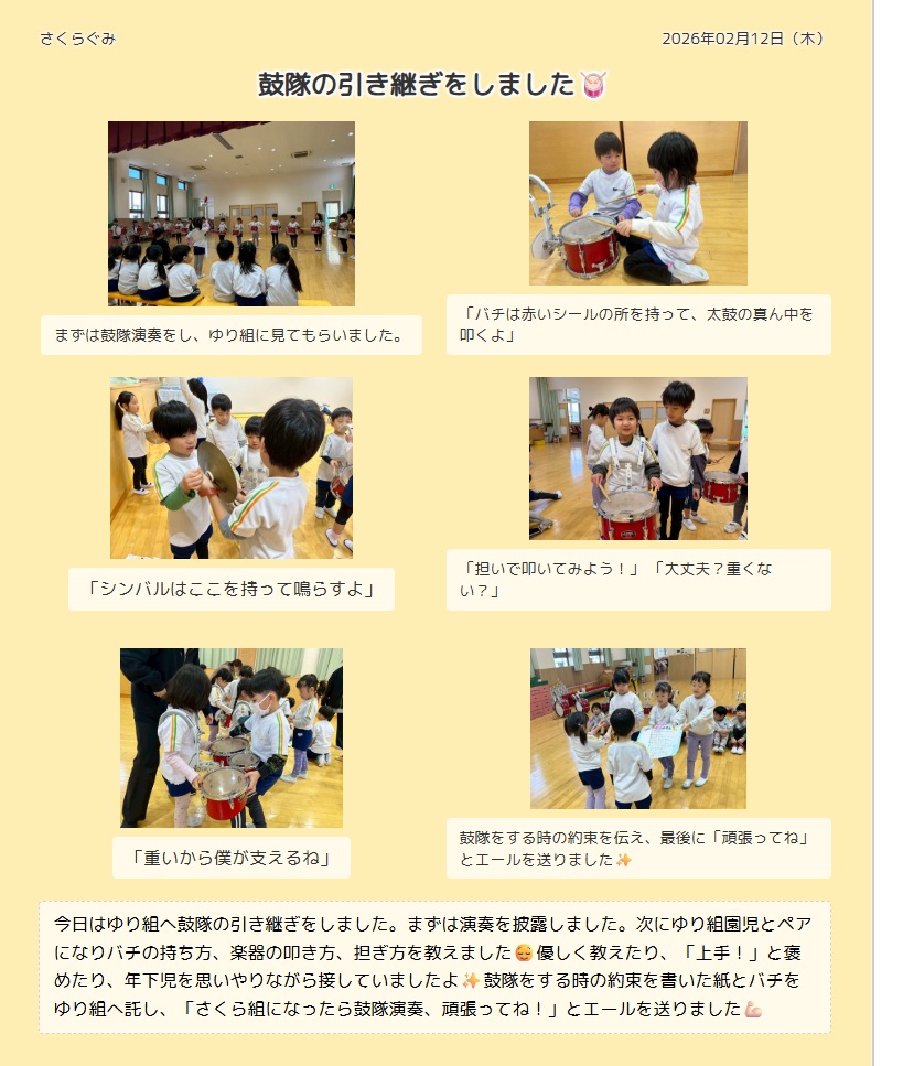 鼓隊の引継ぎ(さくら組からゆり組へ)